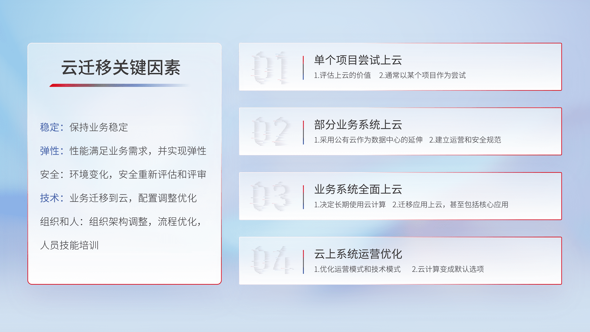 结合实际业务,,,,从规划设计、、、云平台选型、、云原生改造、、、数据迁移、、集成交付,,迁移全过程为客户识别最佳上云路径,,做好风险识别管理,,,,设计网络架构、、身份权限、、安全审计合规、、、操作审计、、、日志审计、、、、监控告警策略、、、多站点容灾设计等,,,,对云上基础设施进行整体规划,,,提升IT治理水平,,,,以满足弹性、、高可用、、、、高性能的需求。。