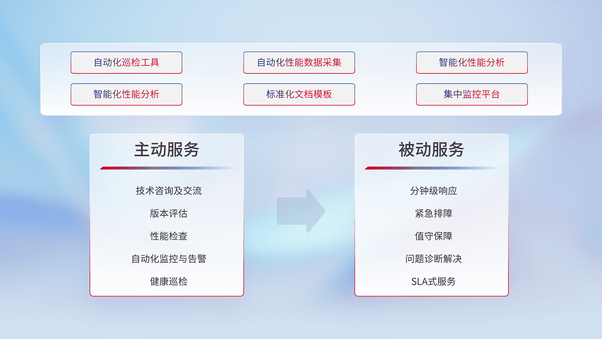 智能化工具和标准化文档,,,保障服务质量,,,,提供主动服务(包含技术咨询、、版本评估、、、、性能检查、、自动化监控与告警、、健康巡检)和被动服务包含(分钟级响应、、、紧急排障、、值守保障、、问题诊断解决、、SLA服务)。。